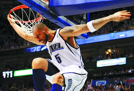 4月25日,犹他爵士队球员布泽尔在比赛中扣篮得分。当日,在2009-2010赛季NBA季后赛首轮比赛中,犹他爵士队主场以117比106战胜丹佛掘金队,从而以3比1的总比分暂时领先。 新华社发