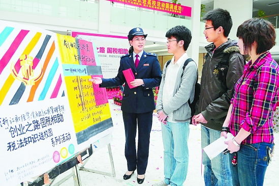 | 4月20日,杭州市国税局与浙江财经学院共同举办了以“创业之路、国税相助”为主题的税收宣传进高校系列活动。通过建立“助推大学生创业税收辅导站”,组织大学生在办税服务厅进行税务实践等活动开展税收宣传。 洪琳 陈崟寅 里尔 摄 |
