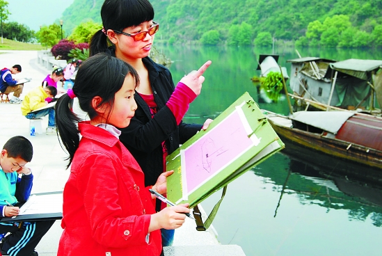 建德新安江畔,近观远望山水间,处处是迷人景致。4月25日下午,一群爱好写生的小学生在老师带领下,来江滨公园写生作画,将停泊在江岸边的小舟,倒映在水中的蓝天定格在画中,绘出春天的美丽画卷。