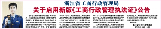 浙江省工商行政管理局决定自2010年5月1日起在全系统启用新版《工商行政管理执法证》,新版执法证由专用皮夹和内卡组成,专用皮夹为竖式黑色皮质,外部正面镂刻工商行政管理徽章图案、“中华人民共和国工商行政管理执法证”字样,背面镂刻英文“AIC”和“中华人民共和国国家工商行政管理总局制”字样;内部上端镶嵌工商行政管理徽章一枚和“工商行政管理”六字,下端放置内卡。内卡正面为曲线条纹背景,持证人彩色照片、姓名,所在县级以上工商行政管理机关名称和执法证号字样,阿拉伯数字证号以及空心英文字母“AIC”;内卡背面为曲线条纹和工商徽标背景,“中华人民共和国工商行政管理执法证”字样,持证人姓名、性别、出生日期,《工商行政管理执法证》有效期限以及英文字母“AIC”。