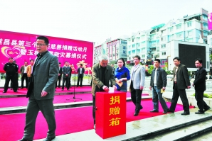 4月23日,遂昌县举行第三个全民慈善捐赠月活动,在平昌广场为玉树地震灾区现场募捐,县委书记葛学斌带头捐款。仅一个上午就筹得善款99.32万元。其中,凯恩集团捐款50万元。 通讯员 潘俊 王久伟 摄