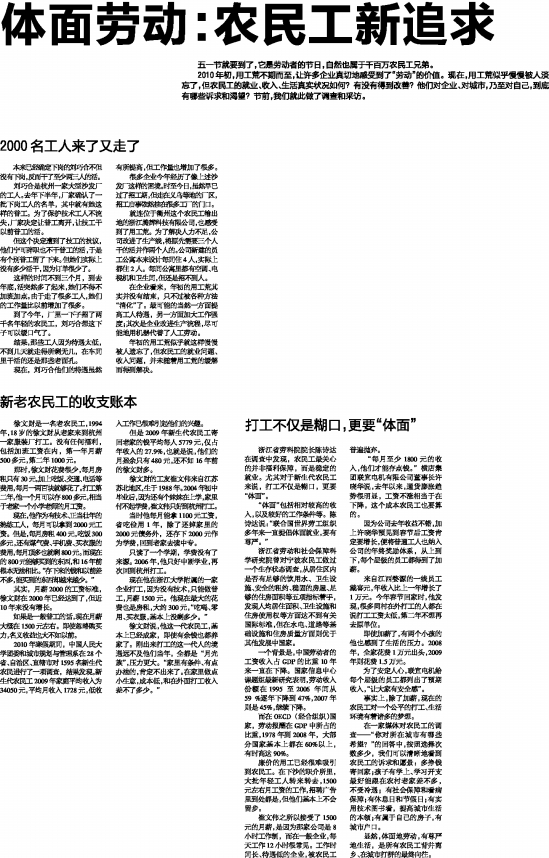 2010年初,用工荒不期而至,让许多企业真切地感受到了“劳动”的价值。现在,用工荒似乎慢慢被人淡忘了,但农民工的就业、收入、生活真实状况如何?有没有得到改善?他们对企业、对城市,乃至对自己,到底有哪些诉求和渴望?节前,我们就此做了调查和采访。