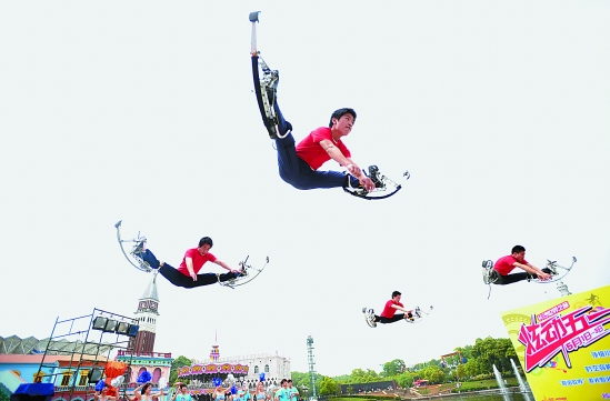 4月28日,演员们在长沙世界之窗公园里表演。当日,在长沙世界之窗公园,参加过北京奥运会闭幕式演出的演员们为观众带来了一场精彩的弹跳高跷表演。 新华社发