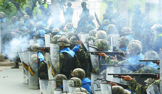 图为4月28日,泰国首都曼谷街头,士兵向“红衫军”开枪。新华社发