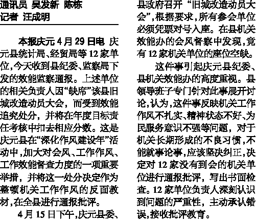 本报庆元4月29日电 庆元县统计局、经贸局等12家单位,今天收到县纪委、监察局下发的效能监察通报。上述单位的相关负责人因“缺席”该县旧城改造动员大会,而受到效能追究处分,并将在年度目标责任考核中扣去相应分数。这是庆元县在“深化作风建设年”活动中,加大对会风、工作作风、工作效能督查力度的一项重要举措,并将这一处分决定作为整顿机关工作作风的反面教材,在全县进行通报批评。
