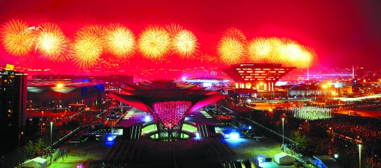 上海世博会开幕式大型灯光喷泉焰火表演。 新华社记者 程敏 摄