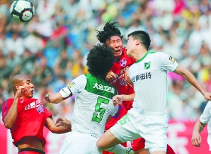 | 5月1日,杭州绿城队球员杜威(左二)、孙吉和重庆力帆队球员何塞(左一)、李毅男(左三)在比赛中争顶。新华社发 |