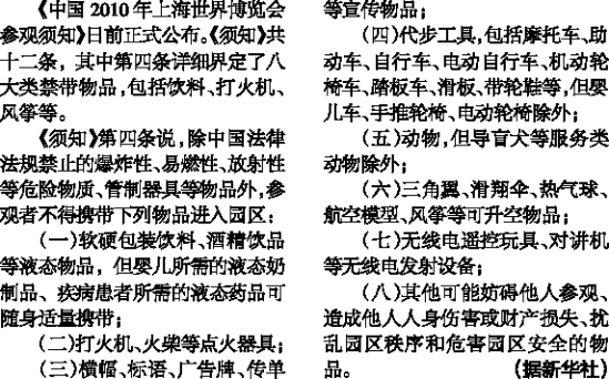 《中国2010年上海世界博览会参观须知》日前正式公布。《须知》共十二条,其中第四条详细界定了八大类禁带物品,包括饮料、打火机、风筝等。