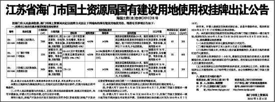 六、本次国有建设用地使用权挂牌地点为海门市国土资源局一楼土地市场;挂牌时间为2010年5月26日8时30分至2010年6月9日10时30分。