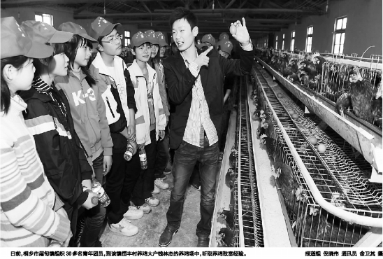 日前,桐乡市屠甸镇组织30多名青年团员,到该镇恒丰村养鸡大户钱林杰的养鸡场中,听取养鸡致富经验。 报道组 倪晓伟 通讯员 金卫其 摄