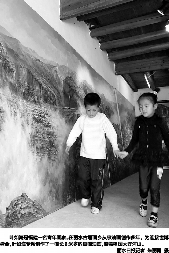 叶如海是福建一名青年画家,在丽水古堰画乡从事油画创作多年。为迎接世博盛会,叶如海专题创作了一幅长8米多的巨幅油画,赞美祖国大好河山。