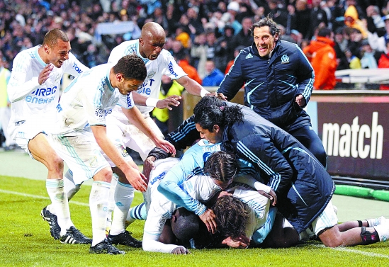 5月5日,马赛队球员庆祝夺冠。当日,在法甲联赛第36轮比赛中,马赛队主场以3比1战胜雷恩队,提前两轮获得冠军。 新华社发