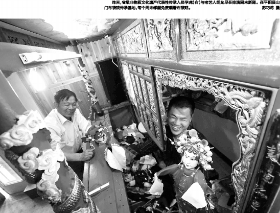 昨天,省级非物质文化遗产代表性传承人郑学虎(右)与老艺人胡允早在排演周末新剧。在平阳县山门布袋戏传承基地,每个周末都能免费观看布袋戏。 苏巧将 摄