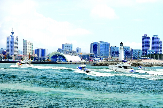 青岛奥帆中心前的游艇巡游 新华社记者 李紫恒 摄