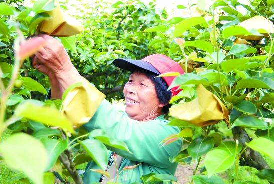 5月10日下午,建德市杨村桥镇绪塘村梨农徐姣凤,正在梨园里给幼果穿上一件件“低碳衣”。当地梨农采用新型的专用梨套,确保果实外型光滑,肉质细嫩,增产增效。