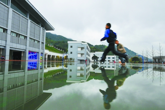 汶川县水磨镇,两位小学生走在雨后的八一水磨小学里。 新华社发