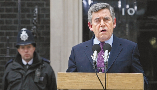 图为5月10日,英国首相布朗在首都伦敦首相官邸外发表声明。新华社发