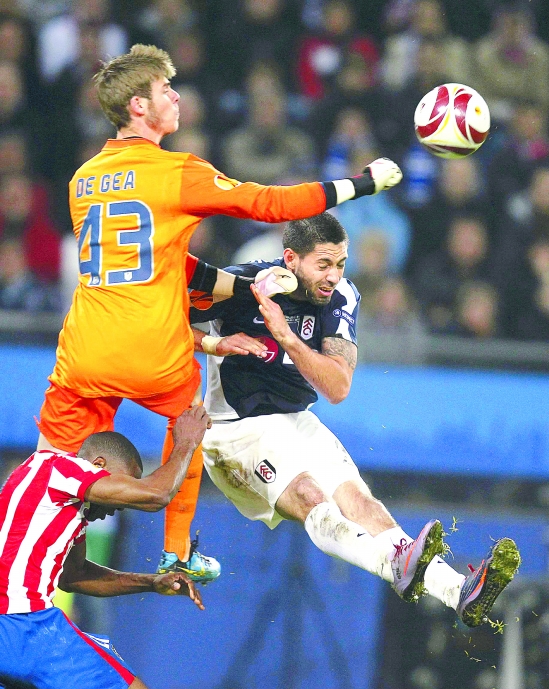 5月12日,马德里竞技队门将赫亚(上)与富勒姆队球员登普西(右)拼抢。当日,在德国汉堡进行的欧罗巴联赛决赛中,马德里竞技队以2比1战胜富勒姆队,获得欧罗巴联赛冠军。 新华社发