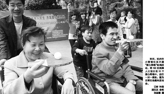 昨天,杭州市小营巷社区开展“爱心网格”助残活动,将162名残障人士划分至12个爱心网格中,进行一对一救助。图为互帮互助趣味运动会。