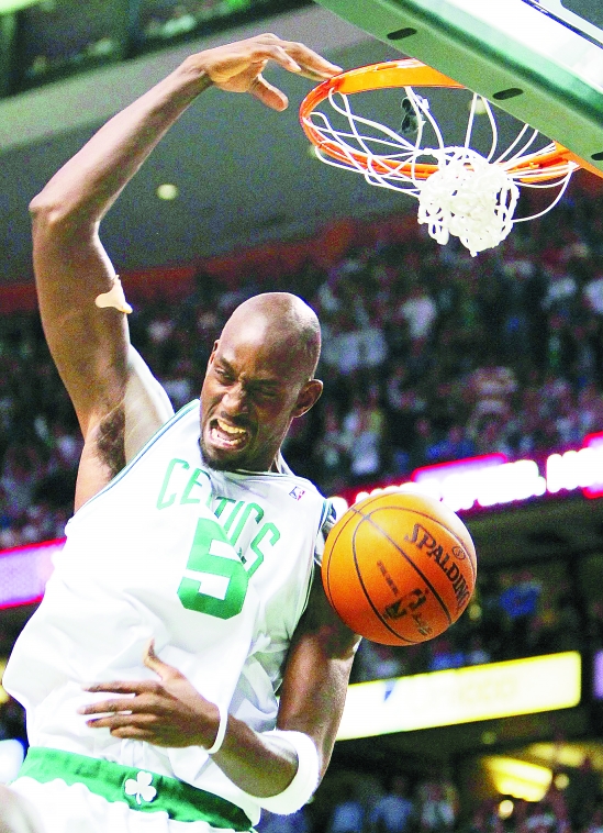 5月13日,凯尔特人队球员凯文·加内特在比赛中扣篮。当日,在NBA季后赛东部半决赛中,主场作战的波士顿凯尔特人队以94比85战胜克利夫兰骑士队,从而以总比分4比2晋级决赛。 新华社发