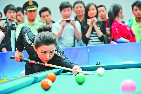 上图:潘晓婷在台球展示推广活动中击球。 新华社记者 李健 摄