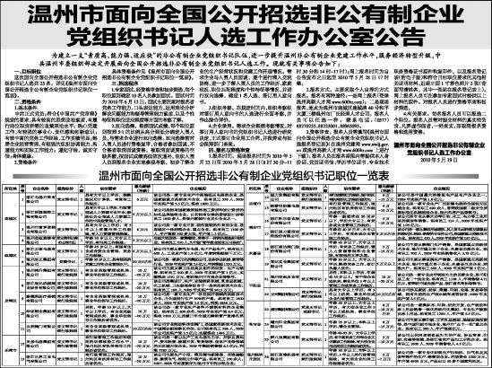 为建立一支“素质高、能力强、适应快”的非公有制企业党组织书记队伍,进一步提升温州非公有制企业党建工作水平,服务经济转型升级,中共温州市委组织部决定开展面向全国公开招选非公有制企业党组织书记人选工作。现就有关事项公告如下: