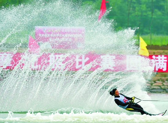 5月18日,浙江队选手黄美丽在比赛中。当日,在合肥举行的第四届全国体育大会滑水女子回旋决赛中,广东队选手秦晓晖、浙江队选手黄美丽获得一等奖。 新华社记者 公磊 摄