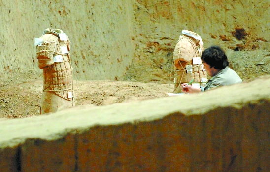 图为5月18日,在一号坑发掘现场旁,工作人员正在修复兵俑。 新华社发
