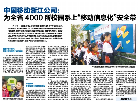 多年以来,中国移动浙江公司围绕省委、省政府提出“八八战略”和“平安浙江”的重大战略目标,充分发挥其专业化移动通信运营商优势,利用在交通、电力、政府等十多个行业移动信息化推广中的丰富经验,全力实施“平安教育”工程,大力提升教育手段的现代化和教育信息化水平,全面推动浙江省教育事业的信息化进程。目前,浙江公司在全省11个市已全面开展了以“平安教育”为主旨的“放心工程”。