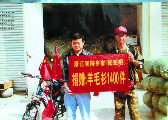 2009年5月,张正明代表桐乡市民向青川民政局捐赠羊毛衫。