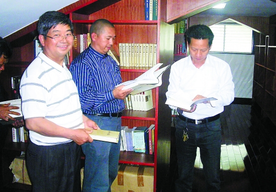▲绍兴县腾豪村私企老板王家德利用旧宅,开设建筑面积750平方米的“会稽山藏书楼”,目前有6000册藏书,免费向村民开放。图为村民在藏书楼看书。