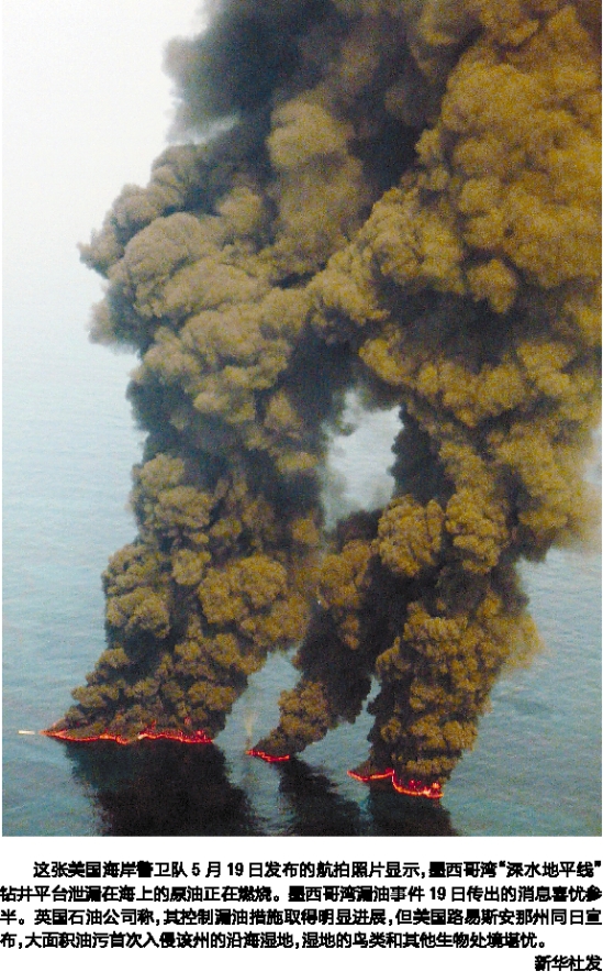 | 这张美国海岸警卫队5月19日发布的航拍照片显示,墨西哥湾“深水地平线”钻井平台泄漏在海上的原油正在燃烧。墨西哥湾漏油事件19日传出的消息喜忧参半。英国石油公司称,其控制漏油措施取得明显进展,但美国路易斯安那州同日宣布,大面积油污首次入侵该州的沿海湿地,湿地的鸟类和其他生物处境堪忧。 新华社发 |