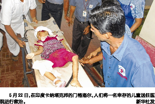 5月22日,在印度卡纳塔克邦的门格洛尔,人们将一名幸存的儿童送往医院进行救治。新华社发
