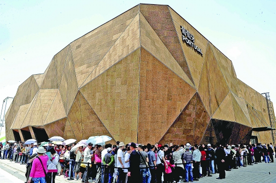 | 主题:葡萄牙,一个面对世界的广场 造型亮点:用大量环保天然的软木筑成外立面幕墙和展区墙壁贴面 场馆简介:展示区以专题划分成四大“时刻”,配套设施包括餐饮区、品酒区等。通过门厅、柱区廊、电子屏幕和主题展区展示葡萄牙的历史、文化、经济和国民生活,展现5个世纪以来葡萄牙与中国的联系及其对现代葡萄牙的影响。 记者 梁臻 摄 |