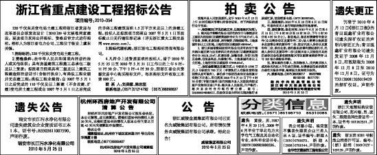 四、报名事项:报名时间:2010年6月10日至6月11日(上午8时30分至11时30分,下午2时30分至4时30分止)。报名地点:报名时请携带有效证件(公民需身份证及复印件二份;法人需营业执照副本及加盖公章的复印件二份、法定代表人身份证及复印件二份、单位公章;委托报名的需有授权委托书、代理人身份证及复印件二份)及绍兴县人民法院开具的拍卖保证金收款收据到绍兴市区新建南路府学弄11号205室办理报名手续。