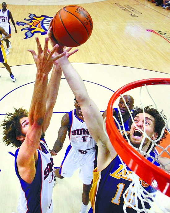 5月23日,湖人队球员加索尔(右)与太阳队球员洛佩斯争抢篮板球。当日,在NBA季后赛西部决赛第三场比赛中,菲尼克斯太阳队主场以118比109战胜洛杉矶湖人队,将总比分扳为1比2。 新华社发