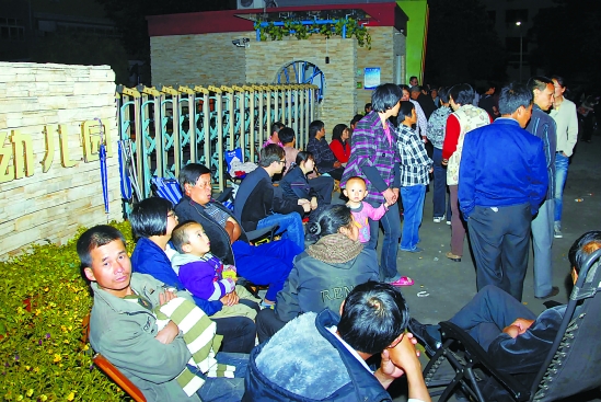 5月23日晚,东阳市实验幼儿园大门前,许多家长排起了长队。24日上午,幼儿园秋季招生报名,由于名额有限,很多家长通宵排队。东阳日报记者 包康轩 摄