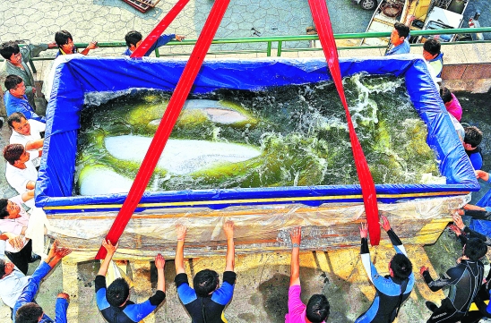 5月24日,三头北极冰海白鲸,从俄罗斯来到杭州极地海洋公园。今年年底前,该公园还将引进6头白鲸。 记者 梁臻 通讯员 戎静静 摄