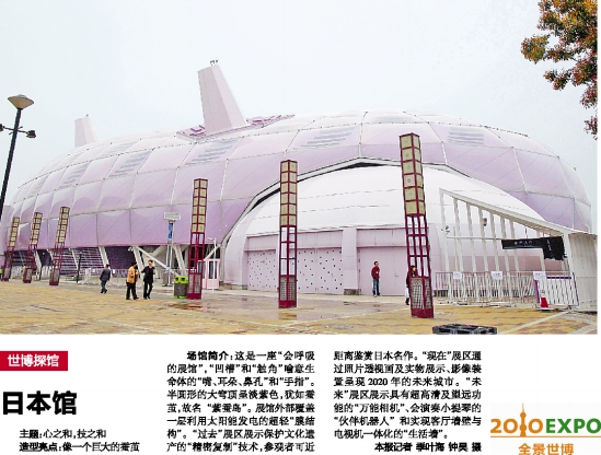 场馆简介:这是一座“会呼吸的展馆”,“凹槽”和“触角”喻意生命体的“嘴、耳朵、鼻孔”和“手指”。半圆形的大穹顶呈淡紫色,犹如蚕茧,故名 “紫蚕岛”。展馆外部覆盖一层利用太阳能发电的超轻“膜结构”。“过去”展区展示保护文化遗产的“精密复制”技术,参观者可近距离鉴赏日本名作。“现在”展区通过照片透视画及实物展示、影像装置呈现2020年的未来城市。“未来”展区展示具有超高清及望远功能的“万能相机”、会演奏小提琴的“伙伴机器人”和实现客厅墙壁与电视机一体化的“生活墙”。
