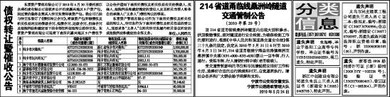 东富资产管理有限公司于2010年4月30日委托浙江永盛拍卖有限公司在杭州公开拍卖嘉兴地区9户资产包,经过竞价最终由竞买人钟亚东竞得该资产包。我公司已经与钟亚东签订了《债权转让合同》,将该资产包所辖债权及相关权益对应的借款合同、抵债合同、还款合同、担保合同及法院判决和裁定项下的全部权利依法转让给钟亚东。东富资产管理有限公司现将下表所列嘉兴地区9户债权予以公告并通知下表所列债权及相关权益有关的借款人、担保人、法院判决和裁定确定的责任人及其相关当事人和各自的承继人(“义务人”)债权转让的事实。