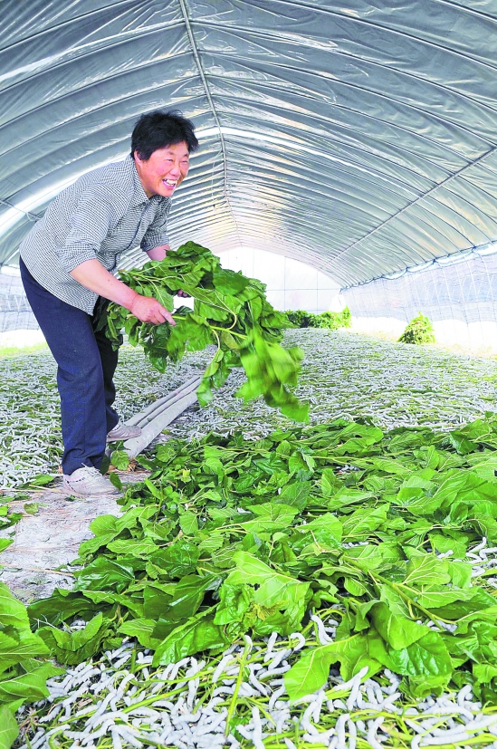 | 5月25日 ,桐乡市龙翔街道元丰村蚕业合作社春蚕大棚里,蚕农们全力以赴做好春蚕后期管理工作,确保春茧优质高产。今年村里100多户农户首次尝试大棚集中饲养春蚕,目前二十多只大棚里饲养的一百多张春蚕已进入老龄期,长势十分良好。 嘉兴日报记者 李剑铭 摄 |