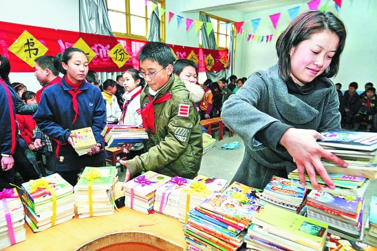 农民工子女教育问题受到全社会关注,这是舟山市南海实验学校的师生为一所农民工子弟学校设立图书室。
