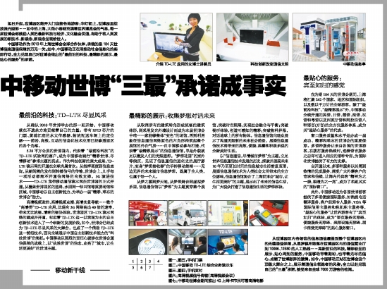 5.28平方公里的世博园内,代表着“最前沿科技”的TD-LTE试验网的落户,成为中国移动践行“精彩世博、尽情移动”参博主题的亮点。作为科技创新的重大成果,TD-LTE演示网的开通在全球尚属首次。从指挥调度到信息查询,从新闻稿的发布到转播信号的传输,世博会上,几乎每一项活动都离不开通信网络的有效支撑。3G演进技术———TD-LTE宽带移动通信演示网在世博园的正式开通,从覆盖世博园区的道路、水面到一轴四馆等重要场馆和区域,中国移动以自主创新能力,为举办一届“精彩、难忘的世博会”助力。