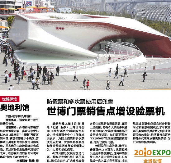 针对目前已发现有伪造门票、收购及兜售已用门票的现象,陈卓夫表示,广大参观者务必前往正规销售渠道购票,谨防上当受骗。持有个人票的参观者可通过眼看、手摸及借助简单的设备进行识别;如门票两侧有“EXPO2010”的压痕或票面被打孔,即为已使用门票。