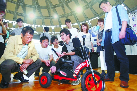 | 浙江工业大学学生正向某企业老总介绍自己的作品“成长童车”。该校艺术学院昨天举行优秀毕业作品展览暨第二届校企合作年会,展出60余件作品供企业挑选。 本报记者 钟昊 通讯员 孙江丽 摄 |