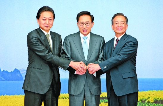 5月29日,国务院总理温家宝在韩国济州岛出席第三次中日韩领导人会议。这是会议开始前,温家宝总理和韩国总统李明博、日本首相鸠山由纪夫握手合影。