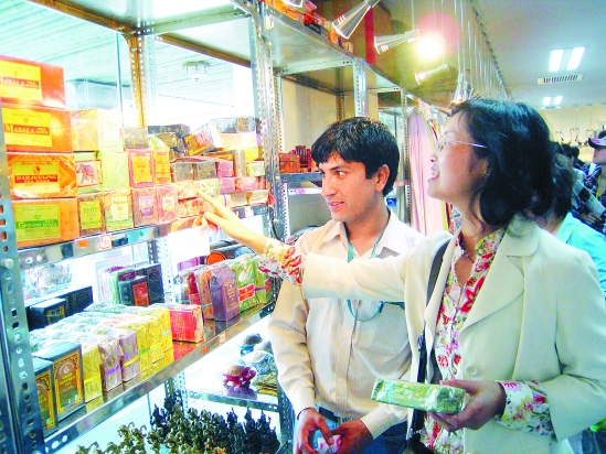 | 近日,浙江采云间茶业公司为了学习外国先进的茶叶经营理念,组织员工分批次在上海世博园里忙“采茶”。通过在世博园里实地调查印度红茶市场、品尝斯里兰卡红茶、观赏日本茶园管理模式等,直接找出自身与国外茶叶经营的差距。图为该公司总经理郑健美(右)与印度茶商交流,了解印度茶市状况。师锋涛 摄 |