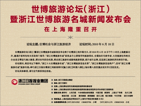 世博旅游论坛(浙江)暨浙江世博旅游名城新闻发布会将于世博浙江周开幕当天,即2010年6月18日下午2时在上海隆重召开,邀请沪浙两地有关党政部门领导、“浙江世博旅游名城”获奖县市主要领导和旅游局长、全国知名专家学者、大型旅游社和相关企业老总等进行脑力激荡,探讨如何抓住机遇,推动浙江旅游名城重构旅游资源,提升城市品牌,促进浙江旅游经济的转型升级。