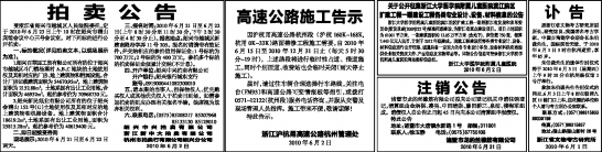 因沪杭甬高速公路杭州段(沪杭160K~168K,杭甬0K~33K)路面整修工程施工需要,自2010年6月15日至2010年12月31日止(每天5时30分~19时),上述路段将进行临时性占道、借道施工,同时个别匝道、收费站也会临时关闭(雨天停止施工)。