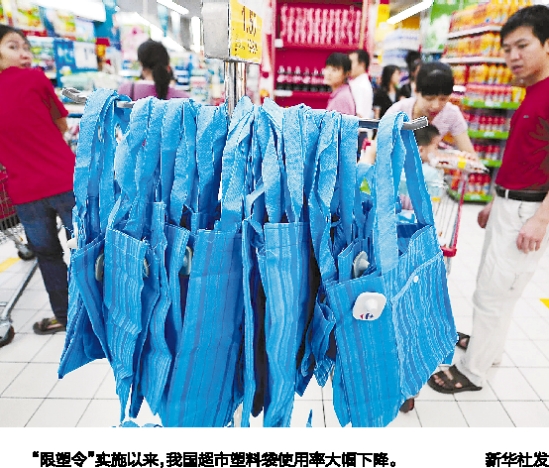“限塑令”实施以来,我国超市塑料袋使用率大幅下降。新华社发